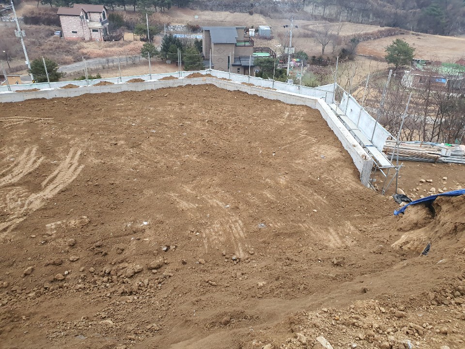 옹벽공사 후 옹벽 뒷면에 되매우기작업 및 평탄작업이있었습니다.