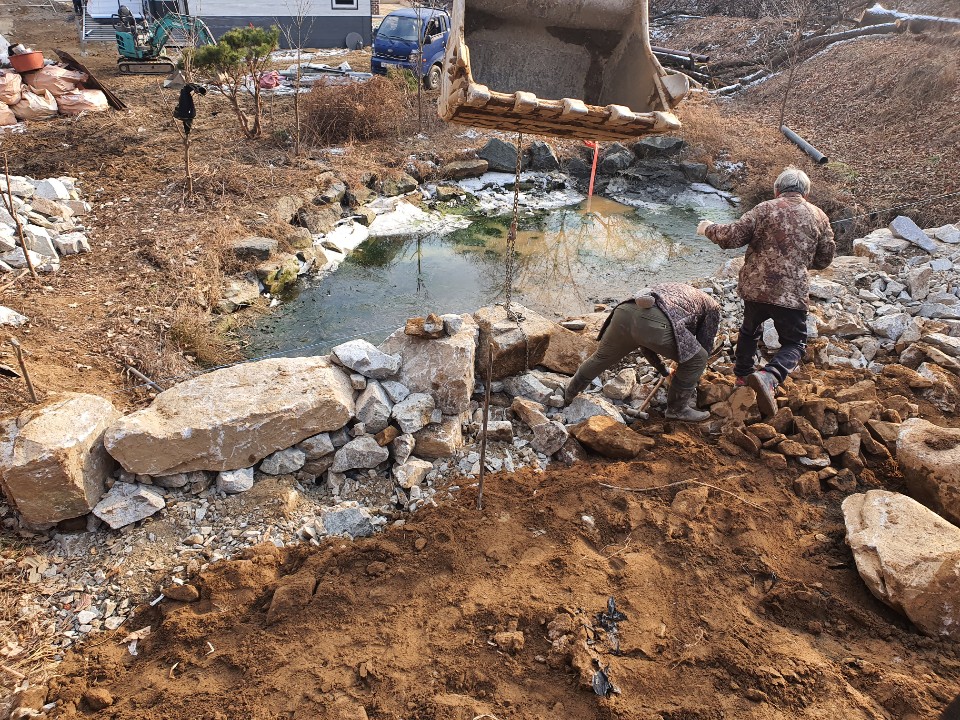 면석 뒤채움작업입니다. 전원주택부지에 연못을 만들거나 조경작업을 진행할때 하는 기초작업으로